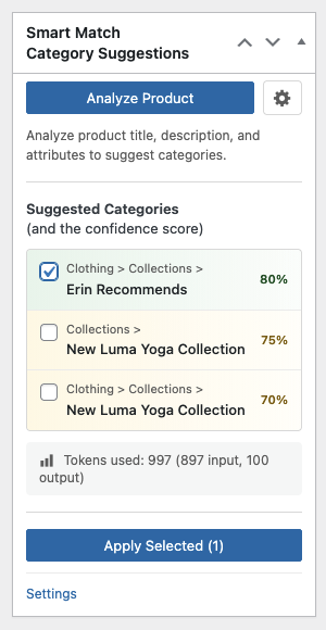 Click “Analyze Product” on any WooCommerce product edit screen. Smart Match reviews all available product data.